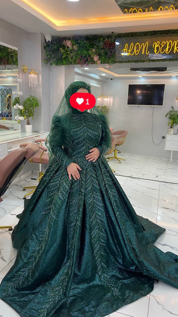 Drapeli ve işlemeli desenli, yüksek yakalı, uzun kollu ve vücuda oturan koyu yeşil nişan elbisesi. Geleneksel tarzda, gösterişli bir modeldir. 44 e kadar oluyor bedeni