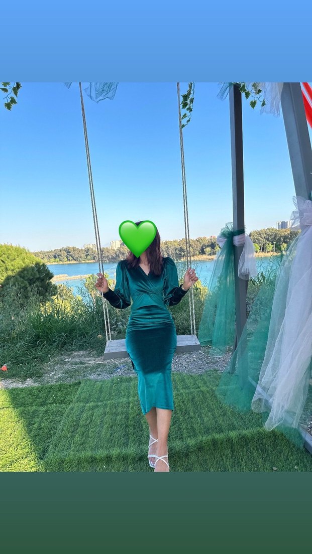 Uzun, v yaka ve uzun kollu yeşil elbise, drapeli tasarıma sahip. Sentetik kumaştan, koyu tie-dye desenli, cesur düğün kombinleri için uygun. 1 kere giyildi kemeri de mevcut .