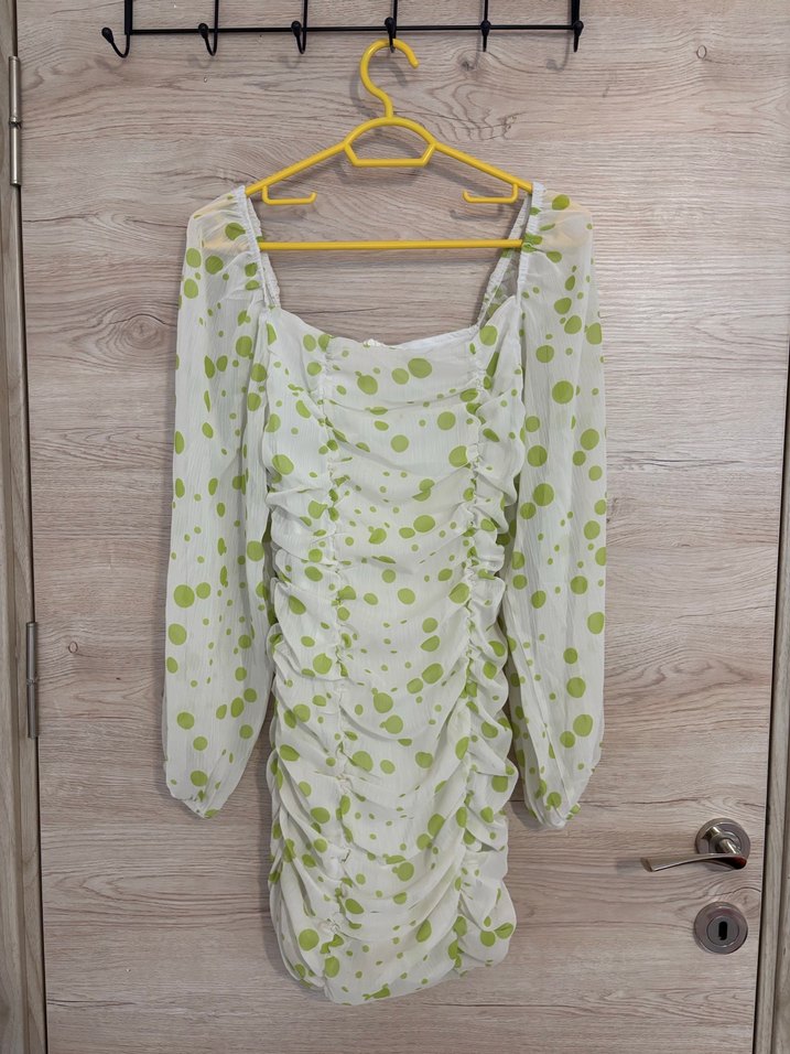 Uzun kollu, V yaka ve drapeli tasarıma sahip yeşil desenli mini elbise. Yumuşak sentetik kumaştan üretilmiştir, günlük kullanım için uygundur.
