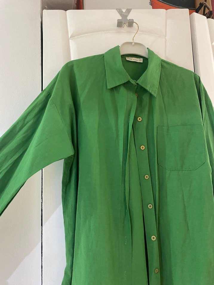 Düğmeli, keten kumaştan yapılmış, uzun kollu, yeşil renkli ve bol kesim gömlek. Minimalist ve sade tarzda, günlük kullanım için uygundur.
