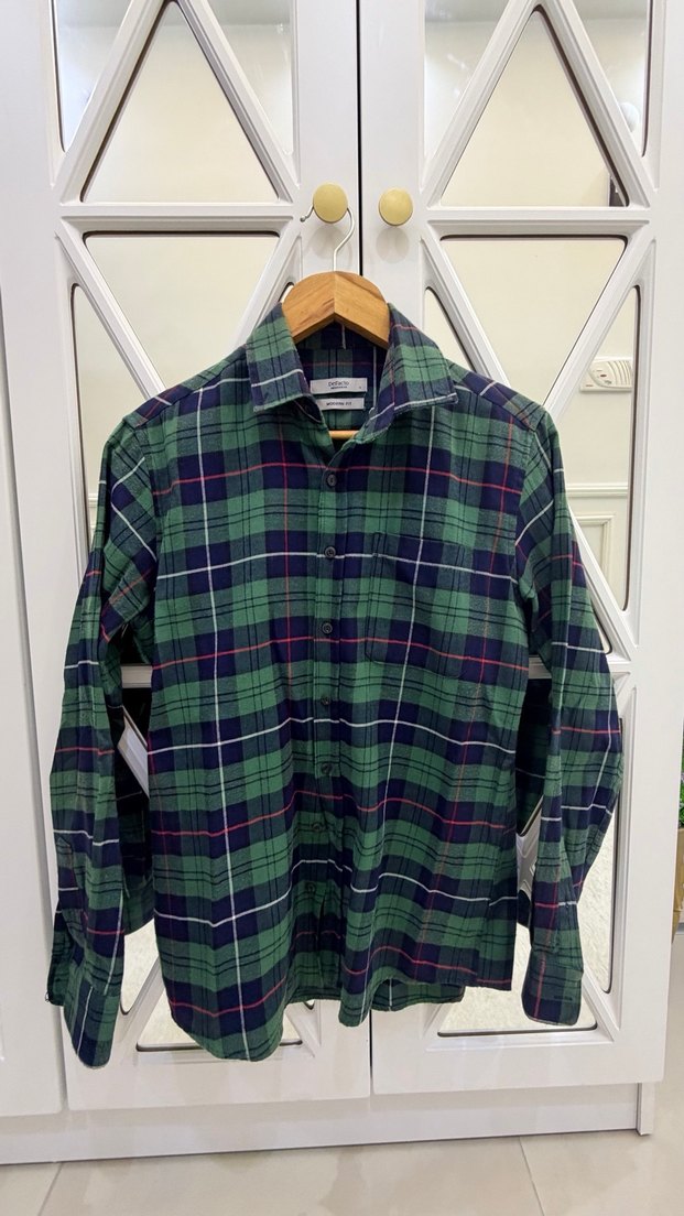 Uzun kollu, düğmeli, yeşil kare desenli erkek gömleği. Normal boyda, regular fit ve notched lapel yakaya sahip, sentetik kumaştan üretilmiştir. Günlük kullanıma uygun.