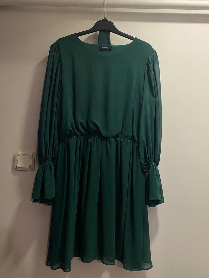 Yeşil diz üstü elbise, uzun kollu ve yuvarlak yakalıdır. Rahat kesimi ve dökümlü tasarımıyla modern klasik stil sunar, ofis kullanımı için uygundur. Belindeki kemer ile boyu ayarlanabilmektedir. 2 kez giyildi temiz ve defosu bulunmamaktadır