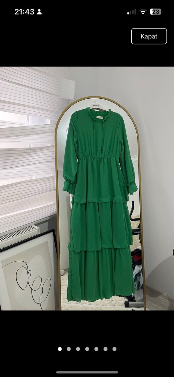 Uzun Kollu Yeşil Fırfırlı Bohem Elbise