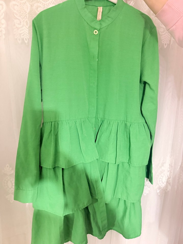 Nefes alabilir keten kumaştan yapılmış, uzun kollu ve fırfırlı detaylara sahip açık yeşil uzun tunik. Yuvarlak yakalı ve bol kesim, bohem tarz için uygun.