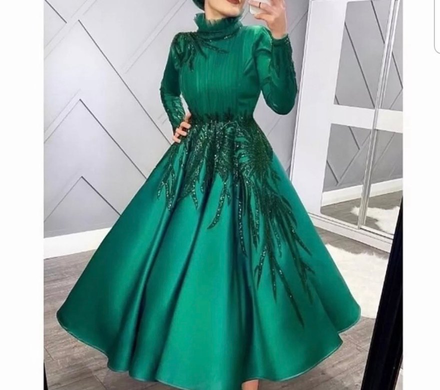 Uzun kollu, yüksek yakalı yeşil abiye elbise, pileli ve işlemeli detaylara sahip. Parlak dokusu ve klasik kesimiyle düğünler için uygundur.