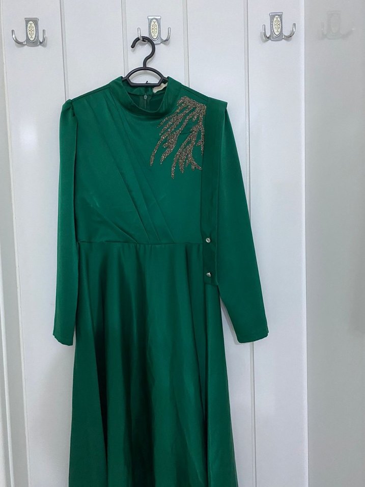 Uzun kollu, yüksek yakalı yeşil abiye elbise. Drapeli ve işlemeli detaylarla şık bir görünüm sunar. Düğünler için uygundur.