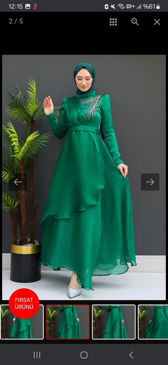 Uzun, bol kesim yeşil elbise, uzun kollu ve straplez yakalıdır. Drapeli katmanlar ve parlak işlemeler içerir, düğünlere uygundur. hiç giyilmedi sıfır üründür etiketli gondericem