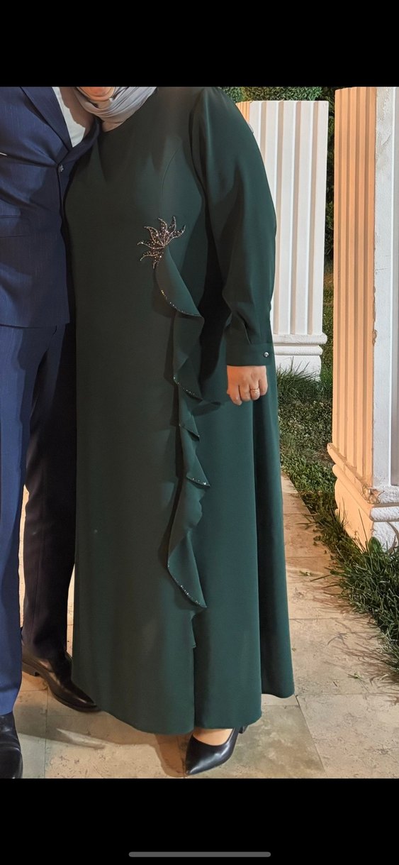 Uzun kollu, yeşil renkli, işlemeli detaylara sahip, yakası kesimli, drapeli, düzenli kesim abiye elbise. Düğünler için uygun, gösterişli ve muhafazakar tarzda.