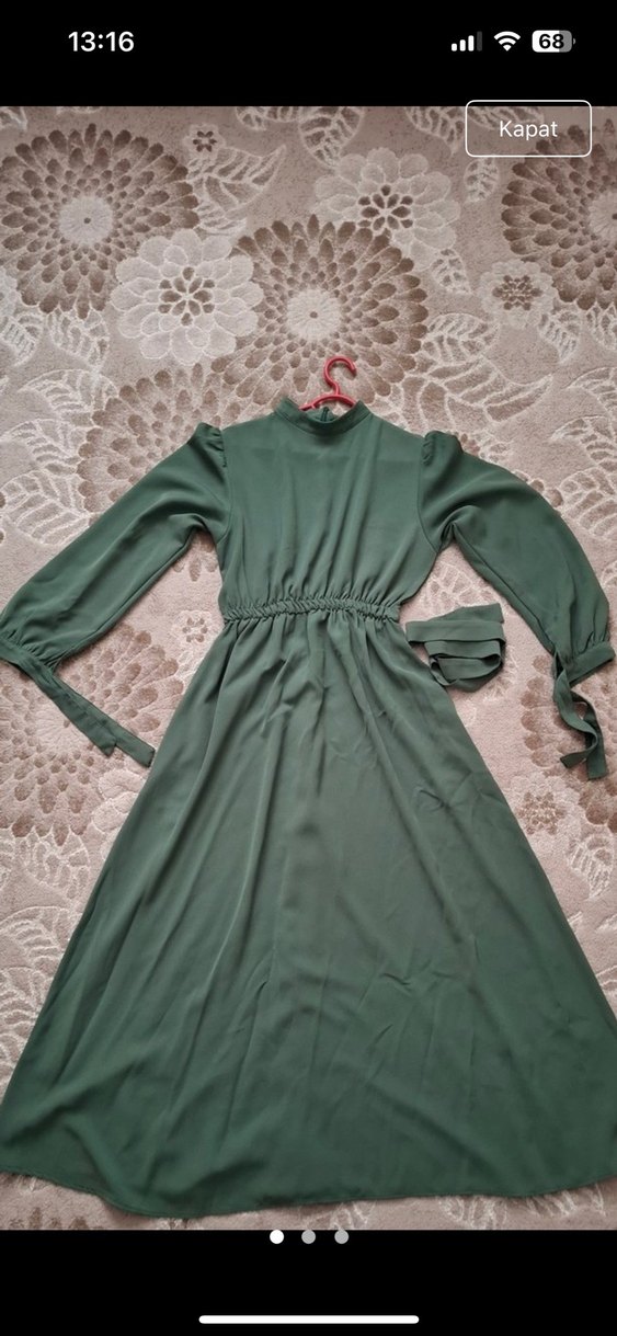 Yüksek yakalı, uzun kollu ve kemerli bu uzun yeşil elbise, rahat kesimi ve yumuşak sentetik kumaşıyla klasik vintage tarzını yansıtıyor.