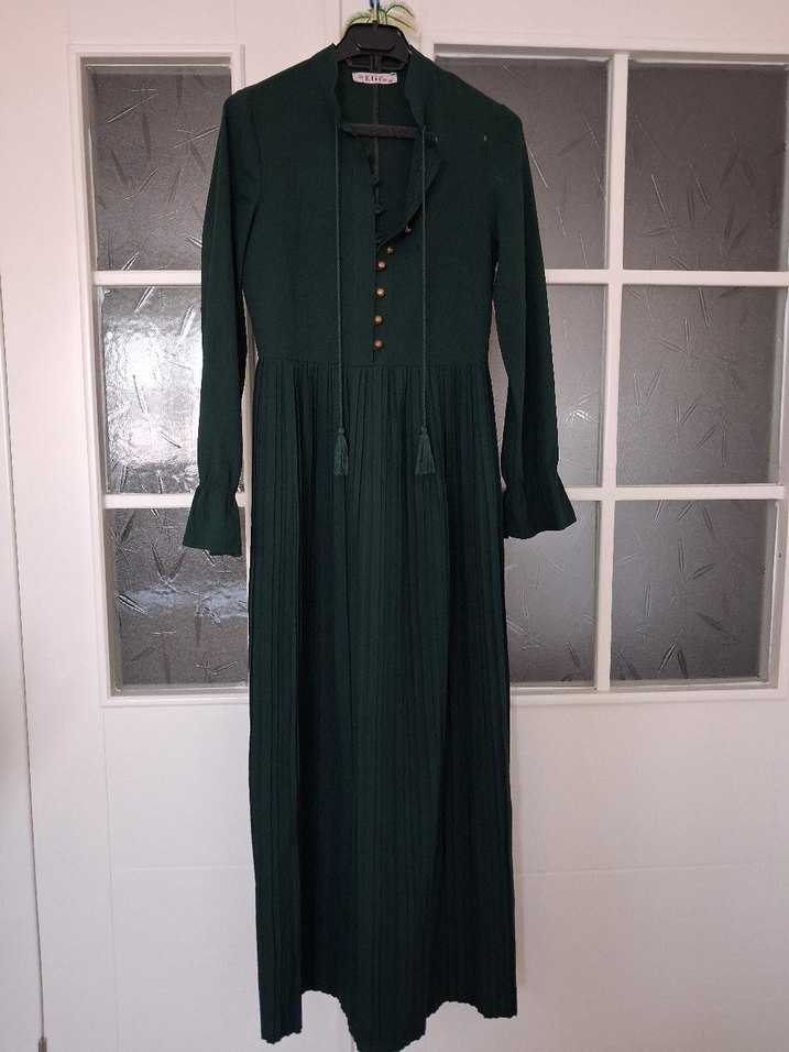 Koyu yeşil keten kumaştan, uzun kollu, yakası kesik ve pileli uzun etekli bol kesim bohem elbise.