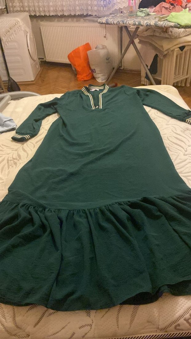 Uzun kollu, keten kumaştan yapılmış, bol kesim yeşil elbise, bohem tarzda yakası yuvarlak ve dökümlü detaylara sahip.