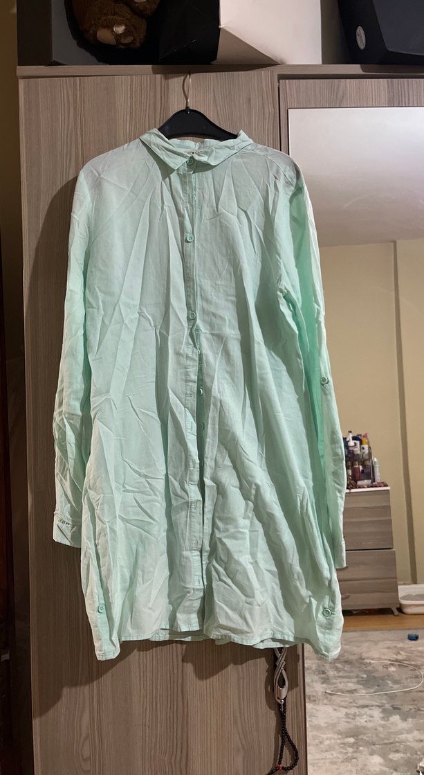 Yumuşak keten kumaştan, düğmeli, yakalı ve gevşek kesimli pastel yeşil gömlek. Günlük rahat kullanım için uygundur. Lc marka İki kol arası 49 cm Tunık boy 83