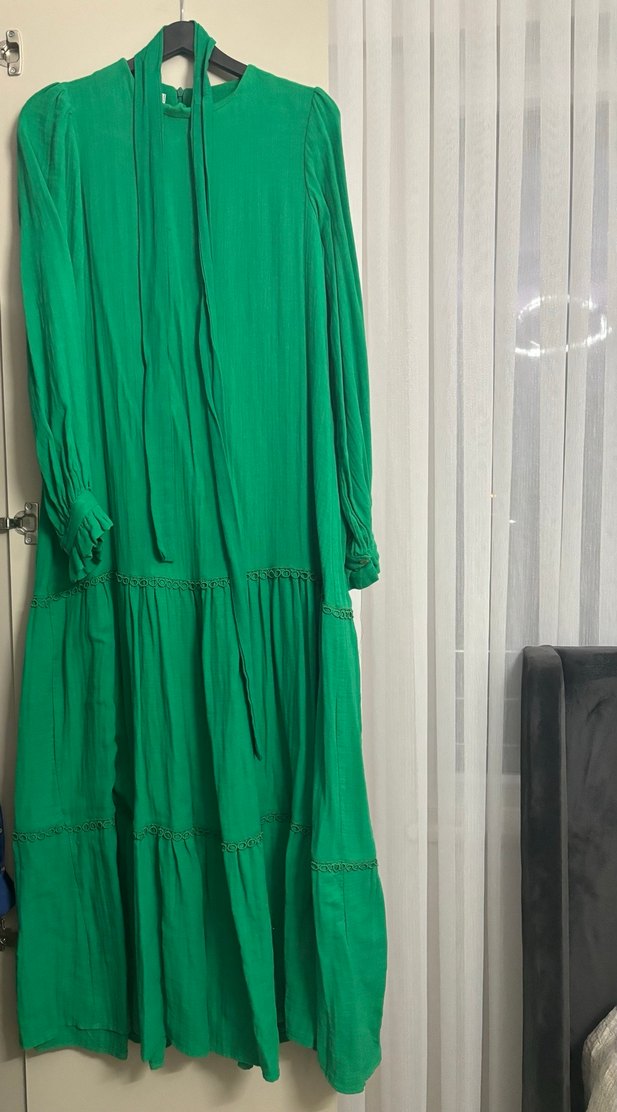 Bu uzun yeşil keten elbise, bol kesim, uzun kollu ve yuvarlak yaka özelliklerine sahiptir. Drapeli tasarımı ve parlak dokusuyla minimalist ve bohem tarzı yansıtır, ofis kullanımı, günlük giyim için uygundur.
