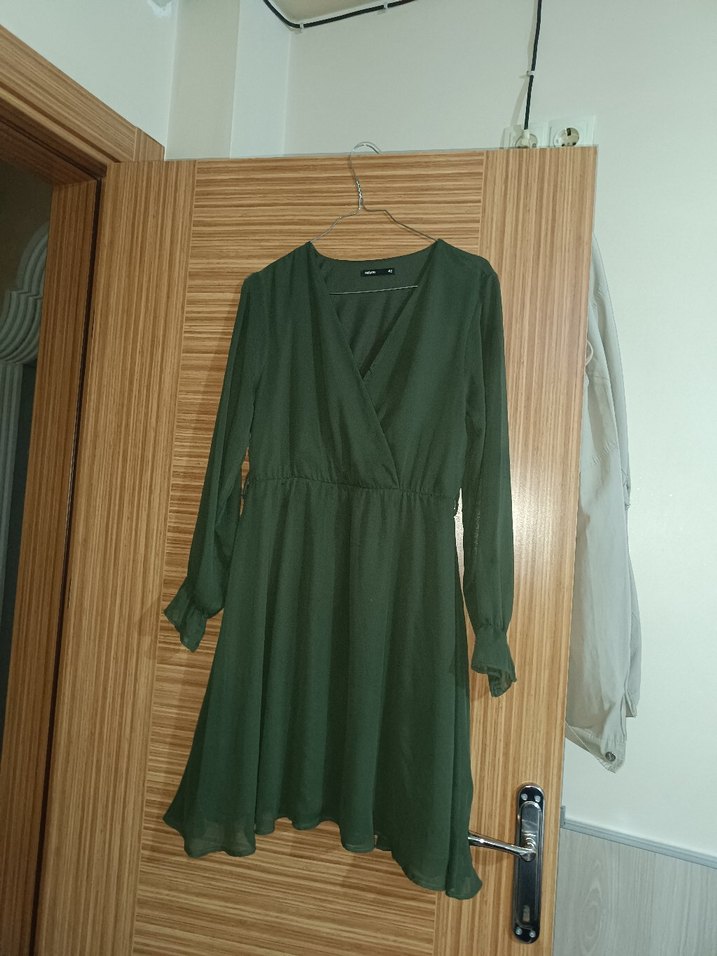 Uzun Kollu Yeşil Midi Elbise