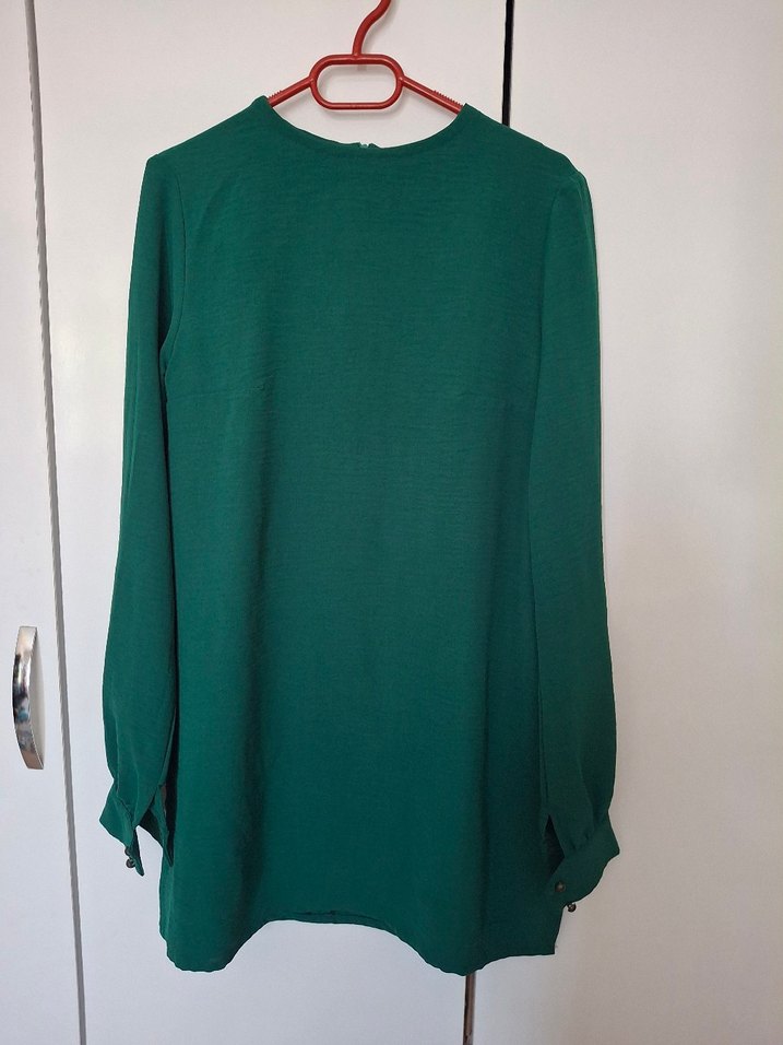 Yeşil renkte, yuvarlak yakalı ve uzun kollu tunik. Salaş kesimi ve drapeli detayları mevcut. hiç kullanılmadı, olmadığı için satıyorum.
