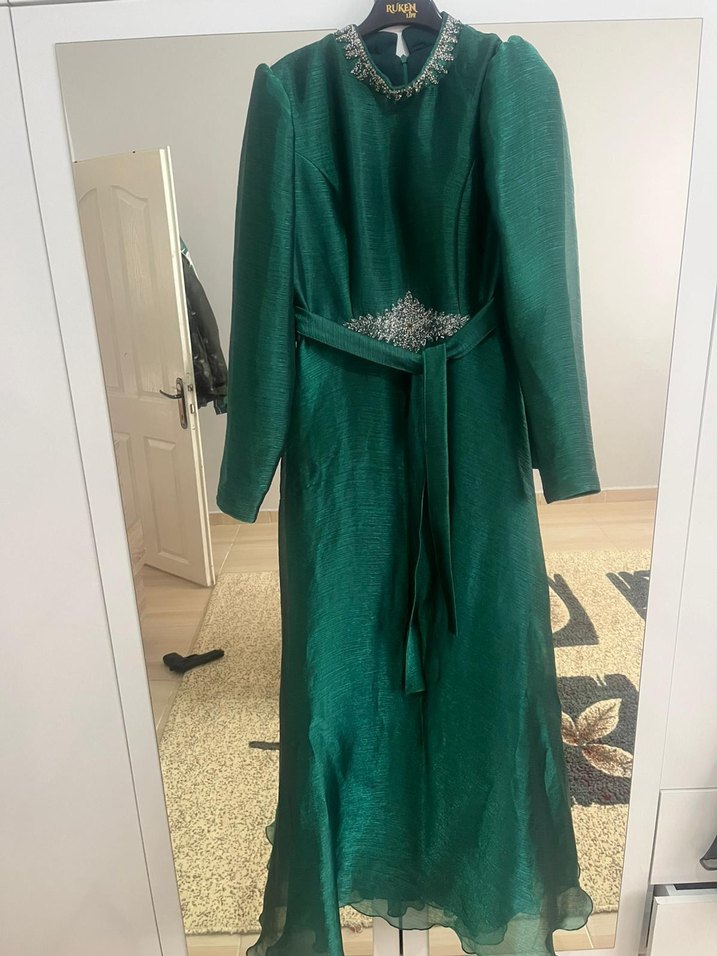 Uzun Kollu Yeşil Nakışlı Abiye Elbise