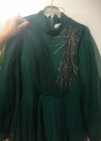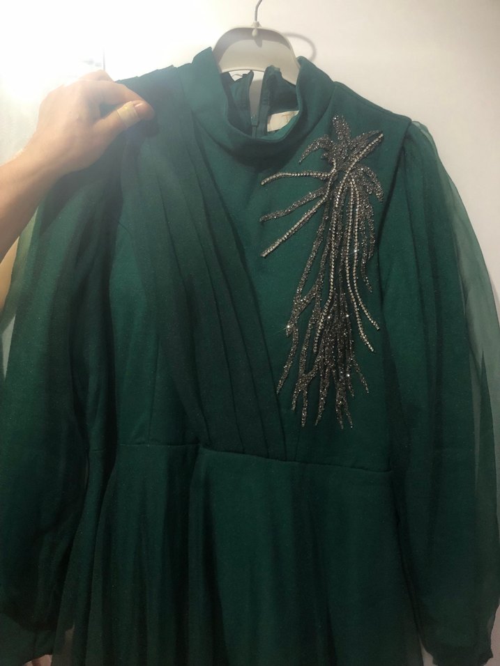 Uzun kollu, yüksek yakalı yeşil abiye elbise, parlak nakış detayları ve drapeli, klasik şıklıkta bohem tarz sunar. Düğünler için uygundur. ✨
