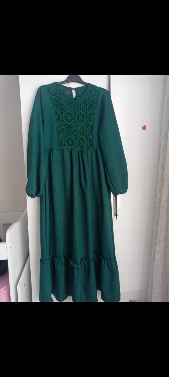 Koyu yeşil uzun elbise, nakışlı triko kumaş, bol kesim, uzun kollu ve yuvarlak yaka. Fırfır detaylarıyla bohem tarzına uygundur.