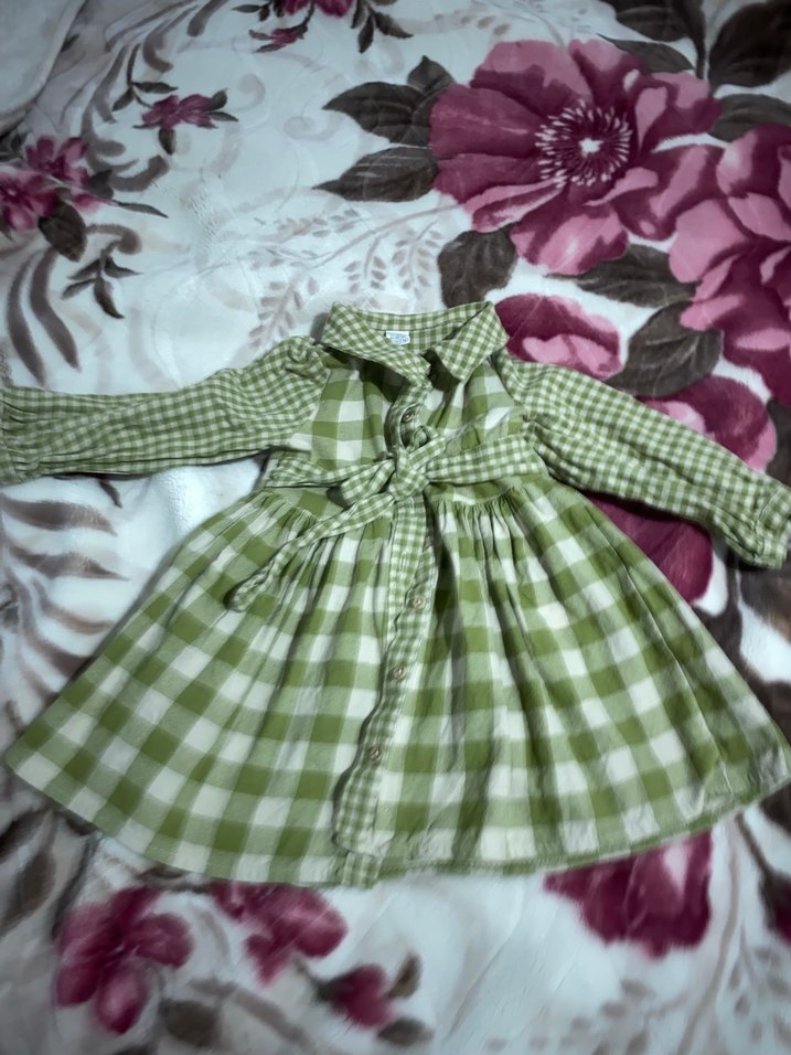 Uzun kollu, düğmeli, pamuklu kumaştan, bol kesim kız elbisesi. Açık yeşil kareli desene ve kesik yaka detayına sahiptir.