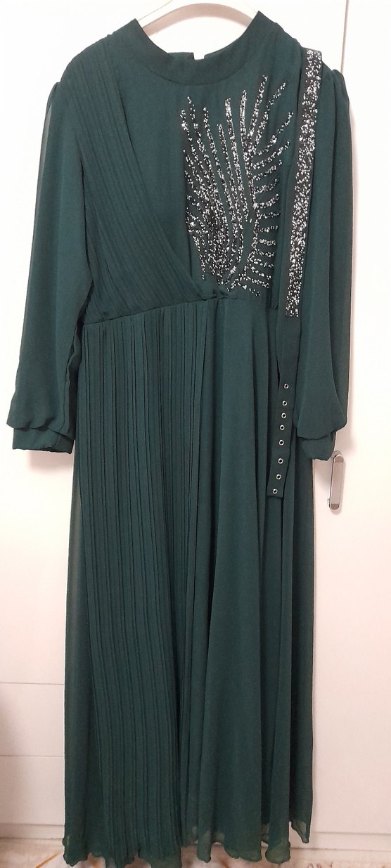 Uzun kollu, pilili ve bol kesim yeşil abiye elbise, işleme detayları ve kesimli yaka ile düğünler için uygundur. Arkadan ayarlanabilir kemeri vardır.