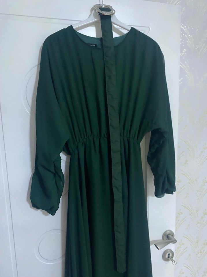 Yüksek yakalı, uzun kollu, yeşil salaş elbise. Drapeli tasarımı ve yumuşak sentetik kumaşı ile ofis ve günlük kullanıma uygundur. Dugunluk elbısedır