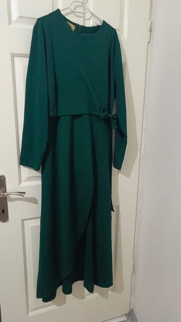 Uzun kollu, salaş kesim ve drapeli detaylara sahip yeşil elbise. Düz, sentetik kumaştan, modest ve minimalist tarzda, günlük kullanıma uygun.