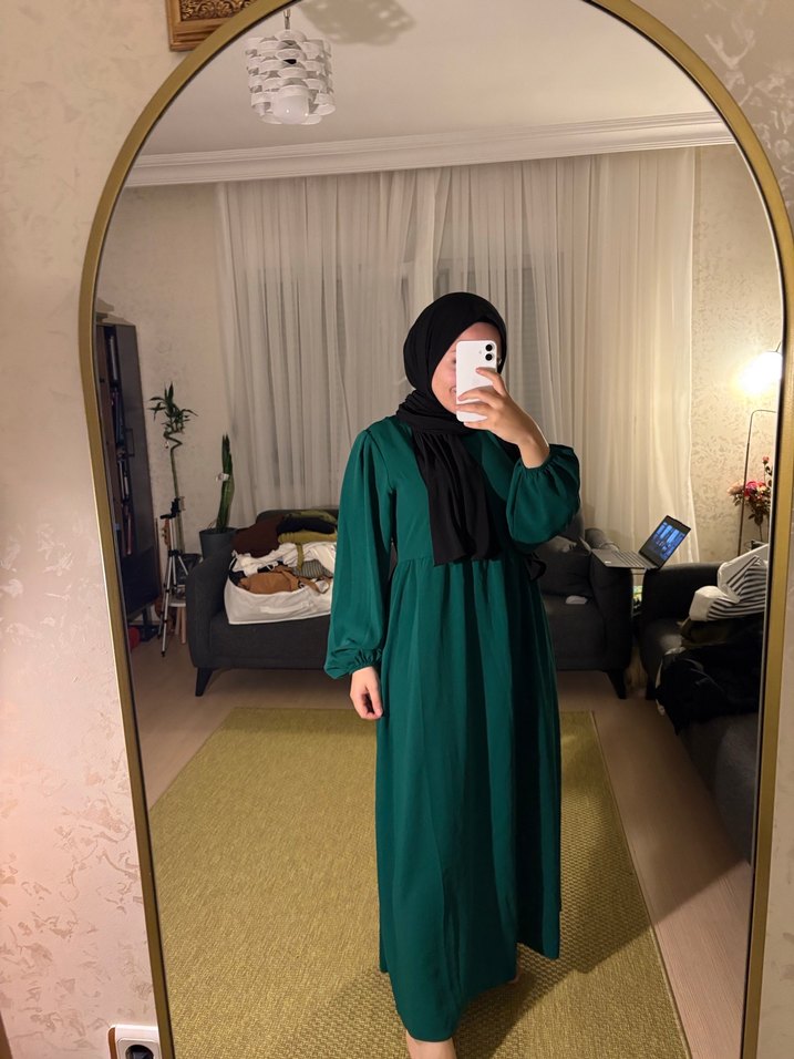 Uzun kollu, yüksek yakalı yeşil elbise, salaş kesimi ve ipeksi dokusuyla günlük kullanıma uygun, sade ve şık bir seçimdir.