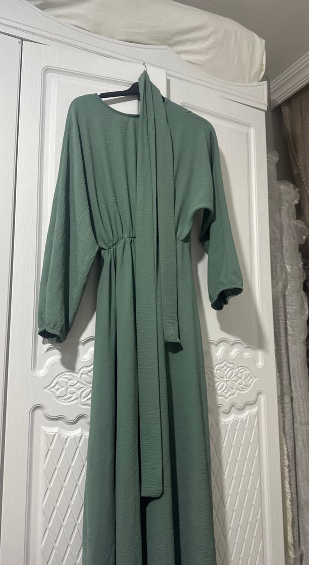 Yeşil keten kumaştan, salaş kesim ve drapeli uzun kollu, yüksek yakalı, sade ve bohem tarzda uzun elbise.