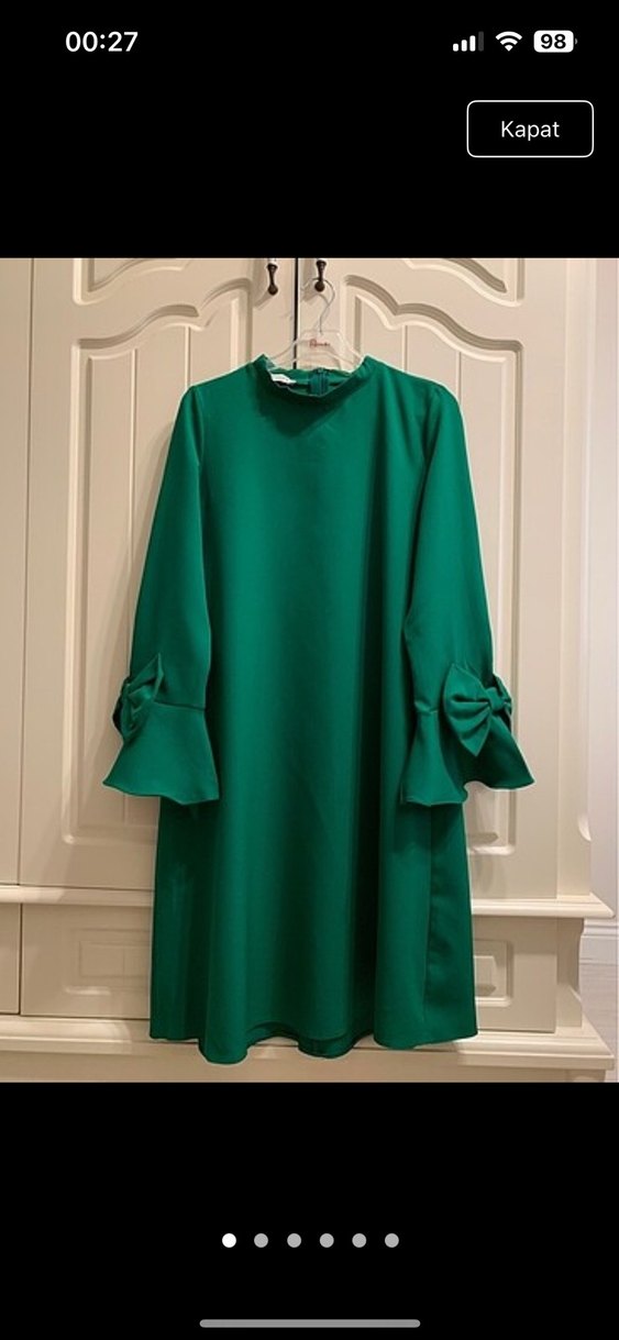 Uzun yeşil tunik, yüksek yakalı ve fiyonk detaylı salaş uzun kollara sahiptir. Dökümlü kesimi ve yumuşak sentetik kumaşıyla ofis için klasik şıklık sunar.