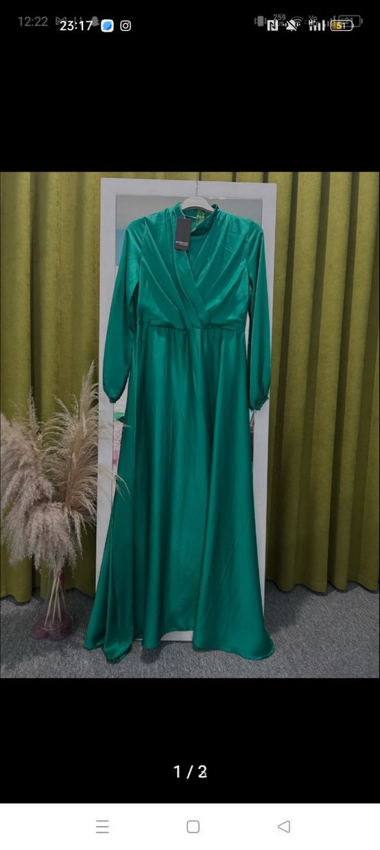 Yeşil renkli, saten görünümlü uzun elbise, bol kesim ve drapeli detaylara sahiptir. Uzun kollu ve V yaka, düğün nişan vs için uygundur. marka temsilidir