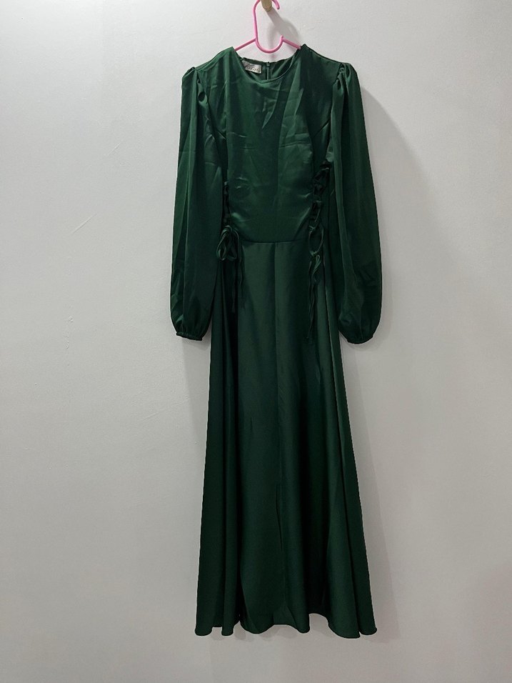 Uzun Kollu Yeşil Saten Uzun Elbise