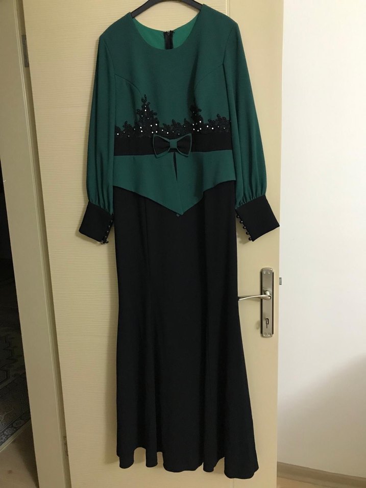 Uzun Kollu Yeşil Siyah abiye elbise