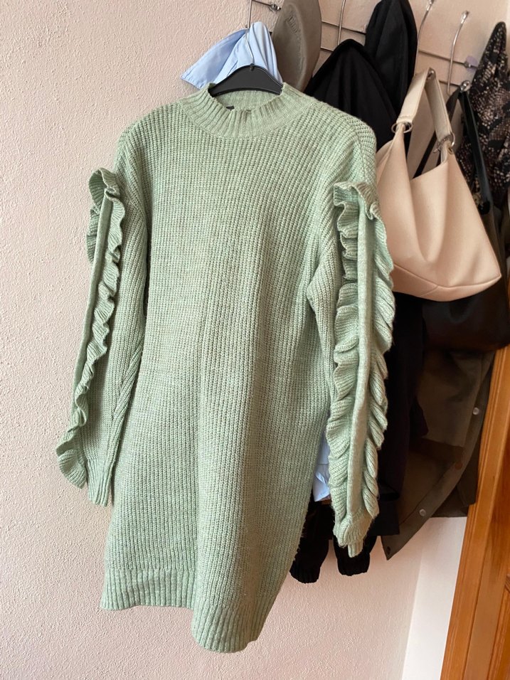 Rahat, uzun boy, yeşil triko kazak. Kollarında fırfır detaylarıyla trend ve günlük sokak stili için uygun.