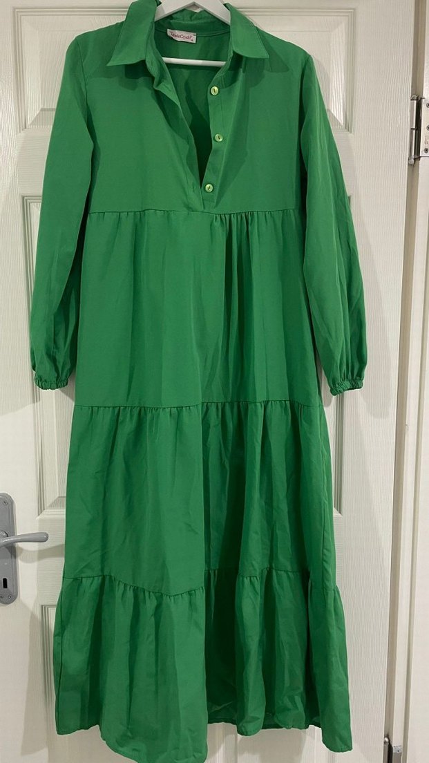 Uzun kollu, yakalı ve bol kesimli bu yeşil elbise volan detaylarına sahiptir. Parlak dokusu ve minimalist bohem tarzı ile günlük kullanıma uygundur.