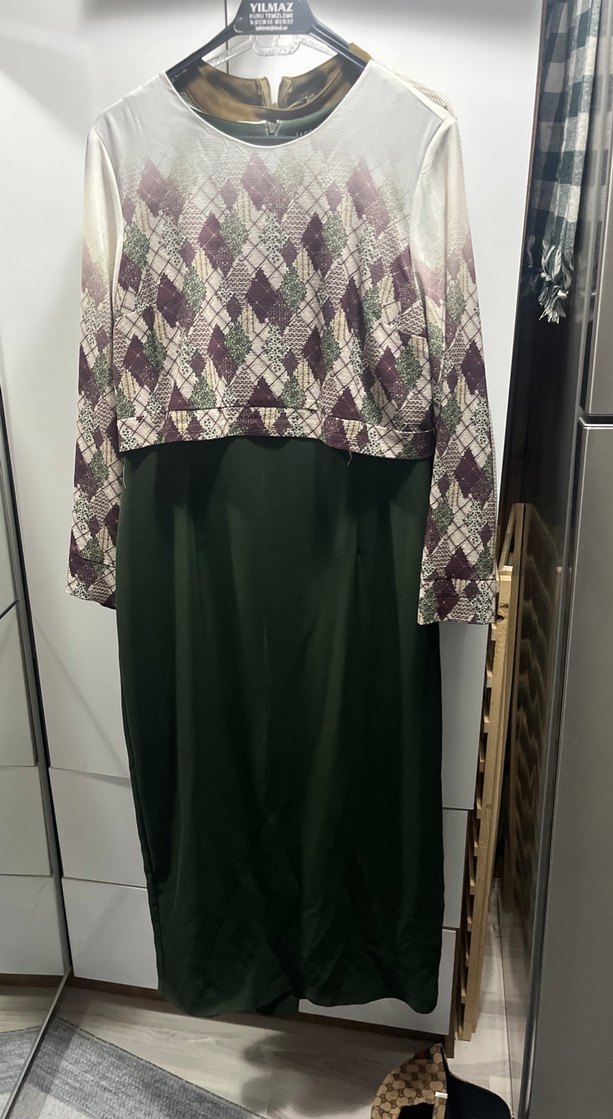 Uzun kollu, yılan desenli üst kısmı ve koyu renk düz etek kısmı olan elbise. Regular fit ve bohem tarzda, ofis için uygun.