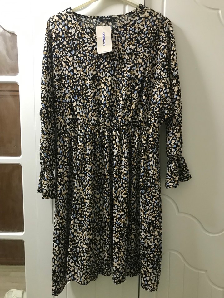 Uzun kollu, volan detaylı ve V yakalı, salaş kesim midi elbise. Sentetik kumaş üstünde koyu yılan deseni, Paris ve bohem tarzı karışımı, ofis için uygun şık bir parça.