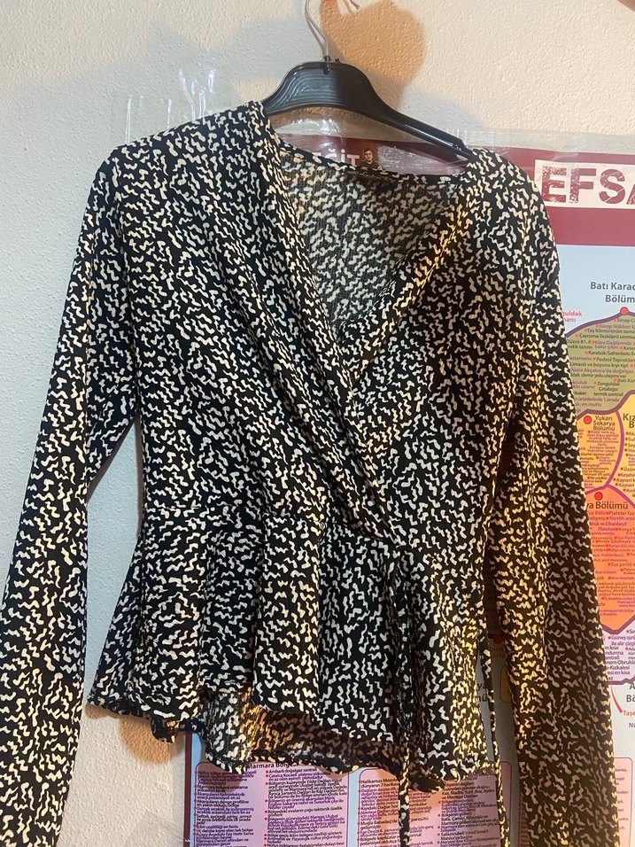 Dar kesim, uzun kollu, düğmeli ve V yakalı kadın bluzudur. Koyu yılan desenli ve sentetik kumaştan üretilmiştir, trend sokak stili için uygundur.