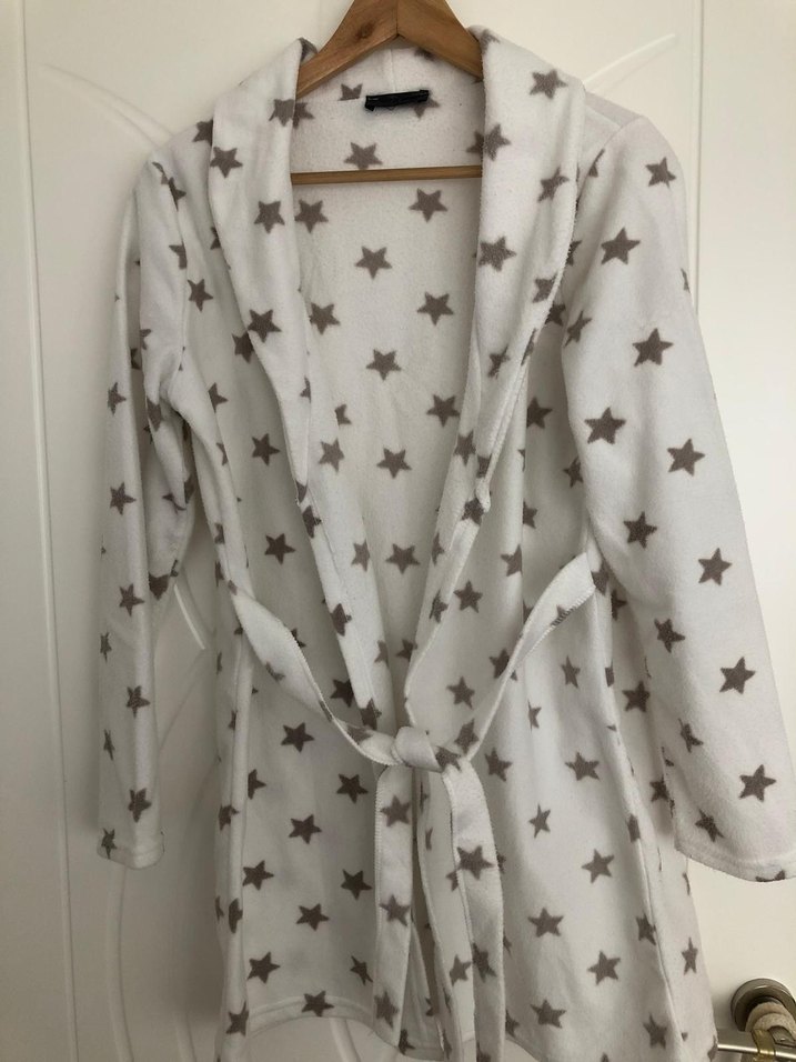 Beyaz, midi boy, uzun kollu ve yıldız desenli kadın bornozu. Rahat kesimi ve kemeriyle konforlu bir kullanım sunar. ⭐