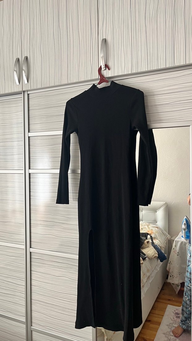 Yüksek yakalı, uzun kollu ve yırtmaçlı siyah, dar kesim kadın elbisesi. Pürüzsüz sentetik kumaştan, minimal goth tarzını yansıtır.