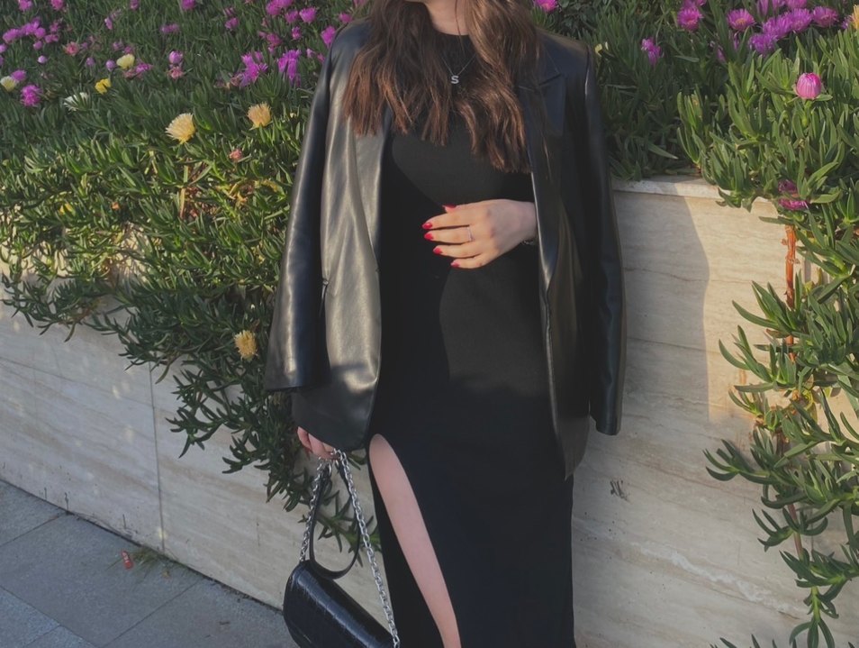 Yüksek yakalı, uzun kollu ve yırtmaçlı, vücuda oturan siyah uzun elbise. Pürüzsüz sentetik kumaştan, minimalist gotik tarz için uygundur.