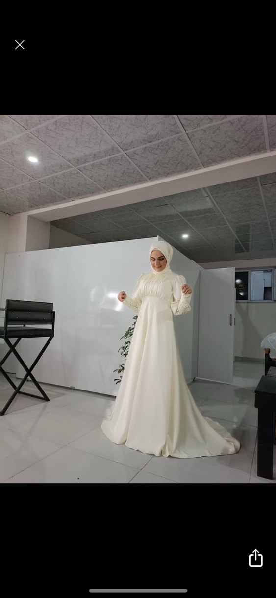 Bu beyaz A kesim gelinlik, yüksek yaka ve uzun kollara sahiptir, mütevazı ve bol kesimdir. Minimalist tarzı ve uzun boyu ile geleneksel düğünlere uygundur. Sadece nikah günü giyildi. Eşarbı ile birlikte gönderilecektir.