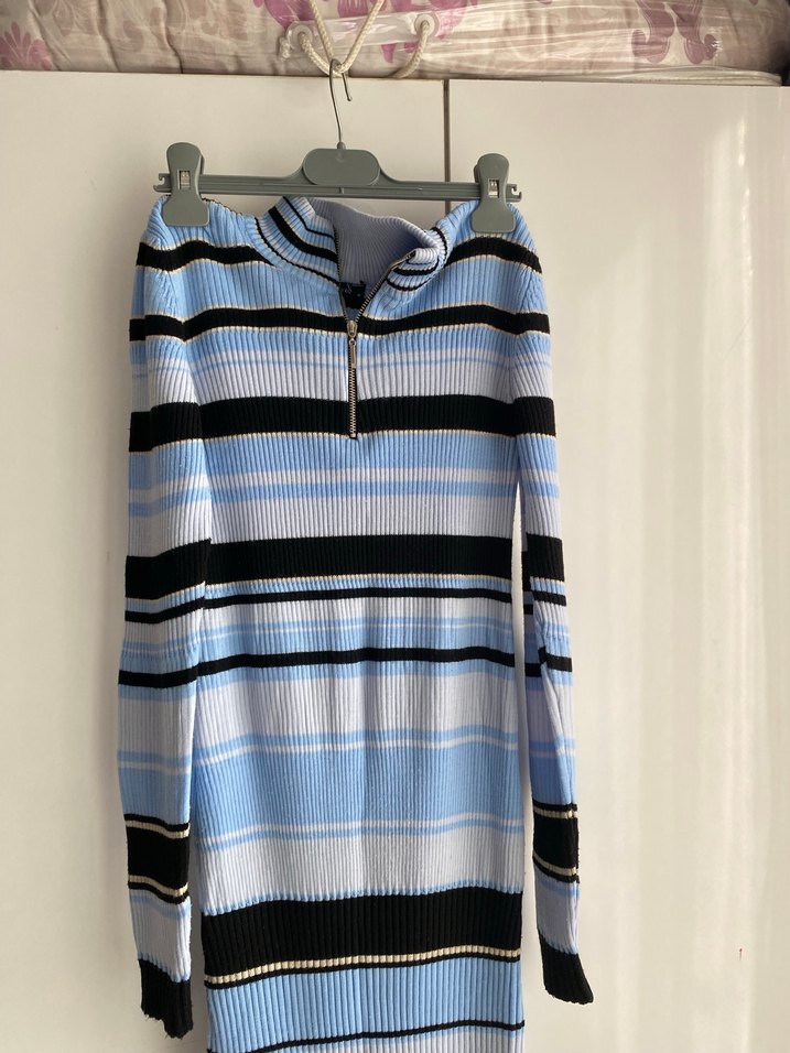 Fitted kesim, yüksek yakalı, uzun kollu kadın kazağı. Mavi ve gri tonlarında çizgili, örgü dokulu, fermuarlı yakası ile günlük sokak stiline uygun.