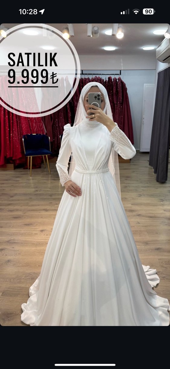 Modest beyaz gelinlik, yüksek yakalı ve uzun kollu, A kesim modeliyle klasik ve zarif bir görünüm sunar. Fiyatı 9.999₺.