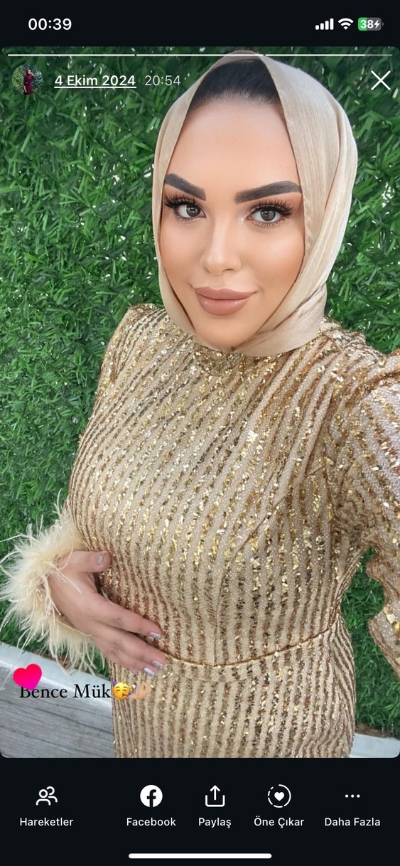Yüksek yakalı, uzun kollu ve kürk detaylı altın renkli abiye elbise, etnik desenli ve parlak yapısıyla parti için uygun. Düğün mezuniyet için uygun fiyatlı abiye 42/44 uyumlu 1.60 boyum bu elbiseyi giydiğimde 70 kg’idim