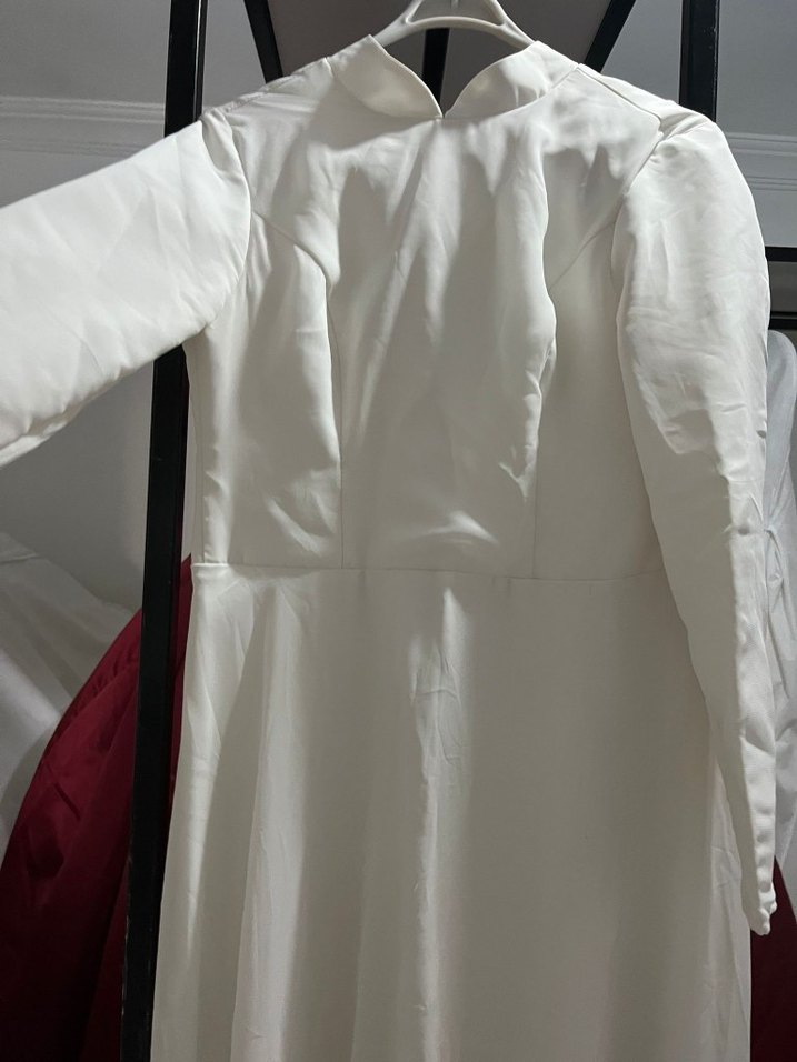 Yüksek yakalı ve uzun kollu beyaz A-line gelinlik, minimal ve şık bir tarz sunar. Fitted kesimiyle modern ve avant-garde bir görünüm sağlar.