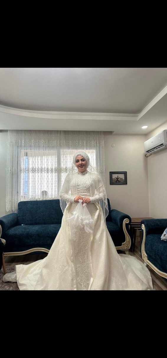 Uzun Kollu Yüksek Yakalı Beyaz Balık Gelinlik