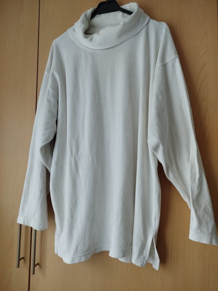 Yüksek yakalı, uzun kollu, gevşek kesim beyaz bluz Yumuşak ve sıcak kadife kumaştan, normal midi boyda, desensiz ve sade tasarımlı.48 beden. küçüçük bir lekesi var. fotografları inceleyin. gögsü 58 boyu 74 cm