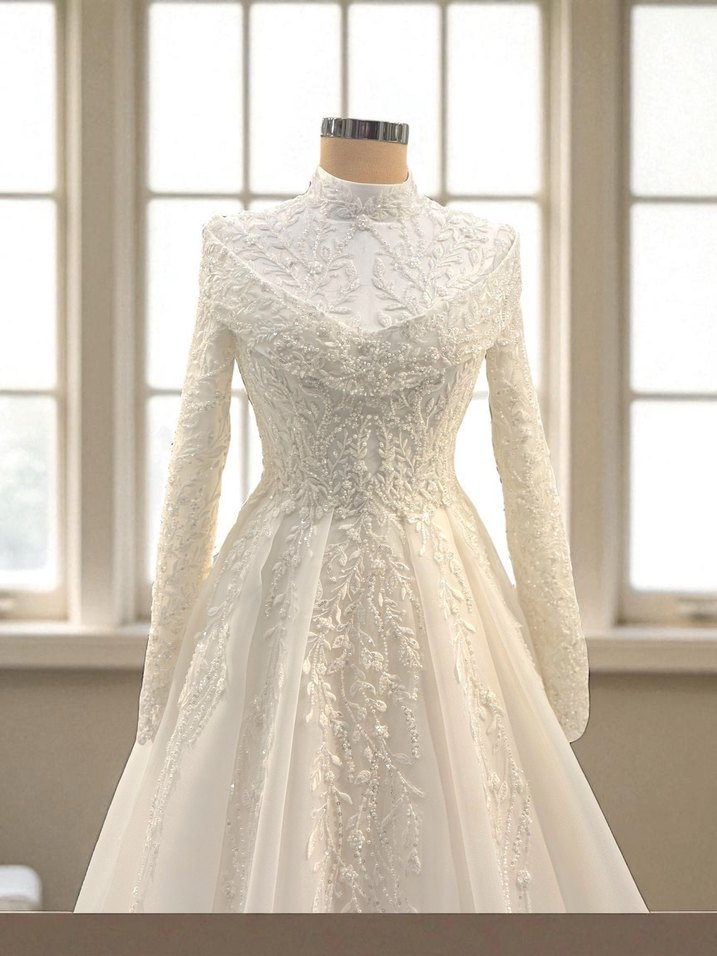 Yüksek yakalı ve uzun kollu beyaz prenses gelinlik, detaylı işlemelere sahip. Modern klasik tarzda, düzenli kesim ve uzun boyda.
