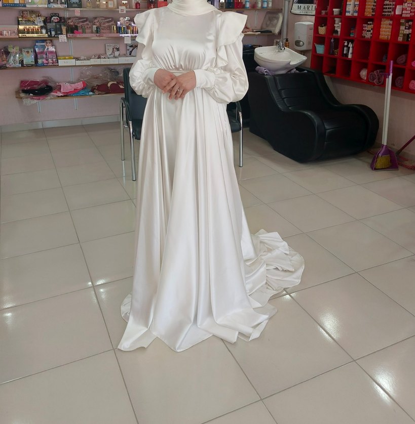 Uzun kollu, yüksek yakalı beyaz gelinlik, klasik ve zarif bir siluet sunar. Yumuşak kumaşı yere kadar akıcıdır.