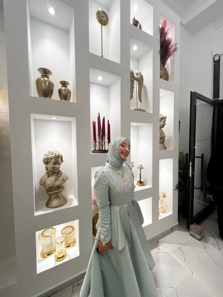 KİRALIKTIR Yüksek yakalı, uzun kollu beyaz tesettür abiye. Etnik desenli, drapeli ve normal kesim, gösterişli düğünler için uygun.